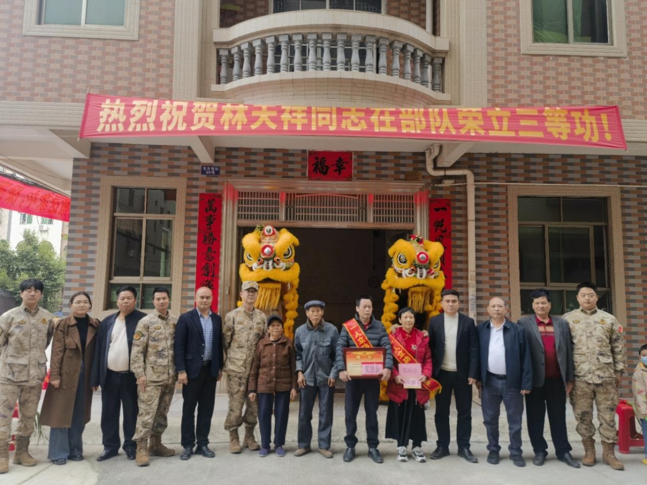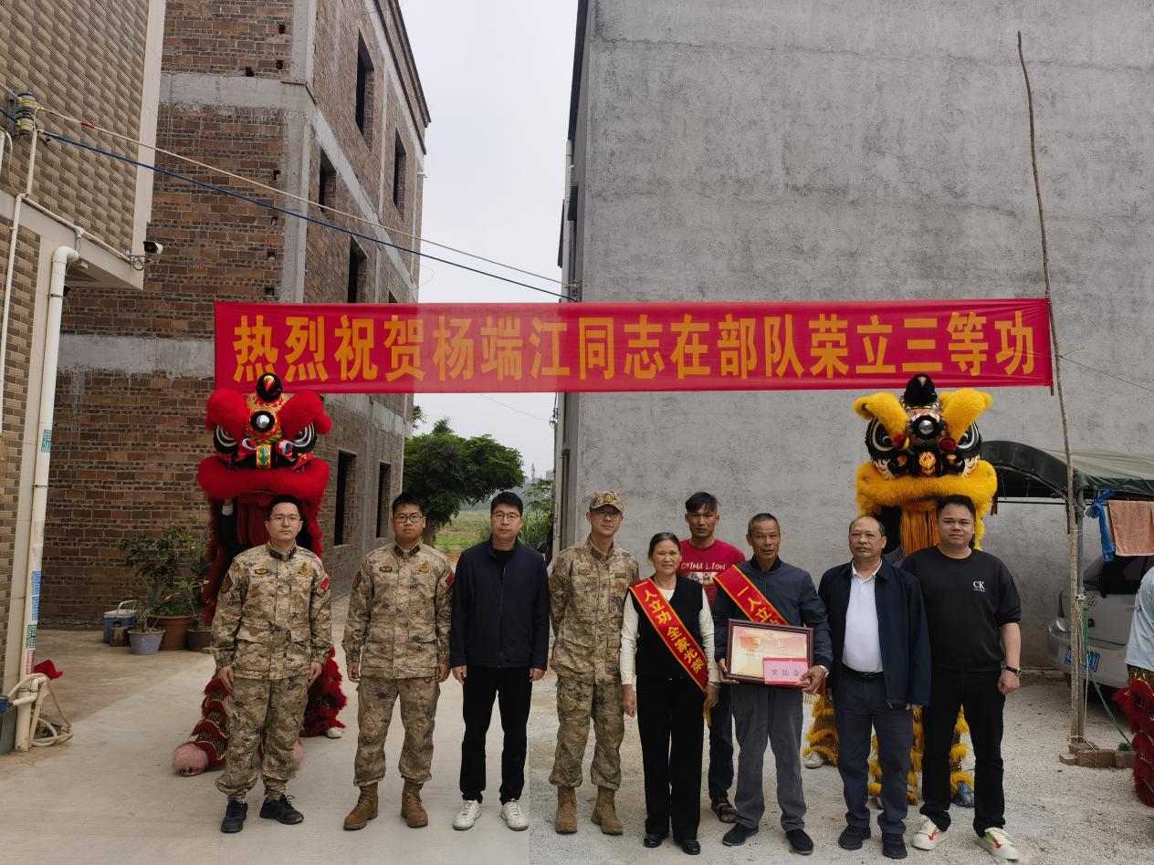 为大力弘扬拥军优属光荣传统,营造“一人立功、全家光荣”的浓厚社会氛围,121日,我市组织开展了2026年首期现役军人立功受奖喜报送达活动。副市长林耀伟、市人武部政委殷毅、市退役军人事务局局长李志强等组成慰问组,专程前往振文镇、黄坡镇、覃巴镇、塘缀镇,为杨康树、陈碧浩、梁彦飞、王钧学、叶冠浩、杨端江、林天祥等7位立功现役军人的家庭上门报喜,送去党和政府的关怀与褒奖。