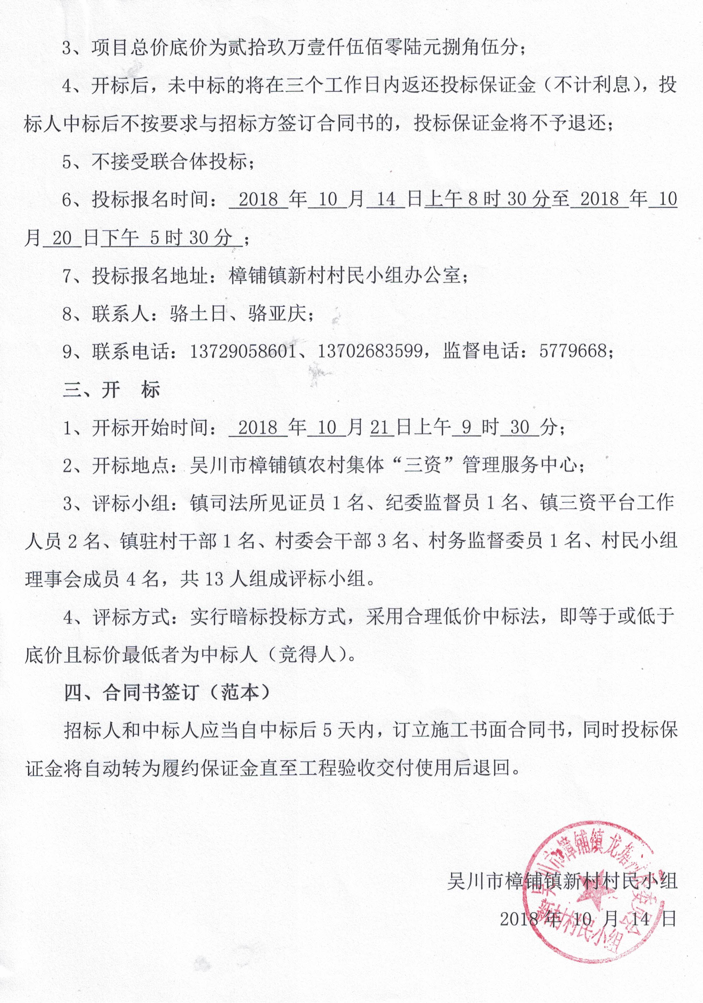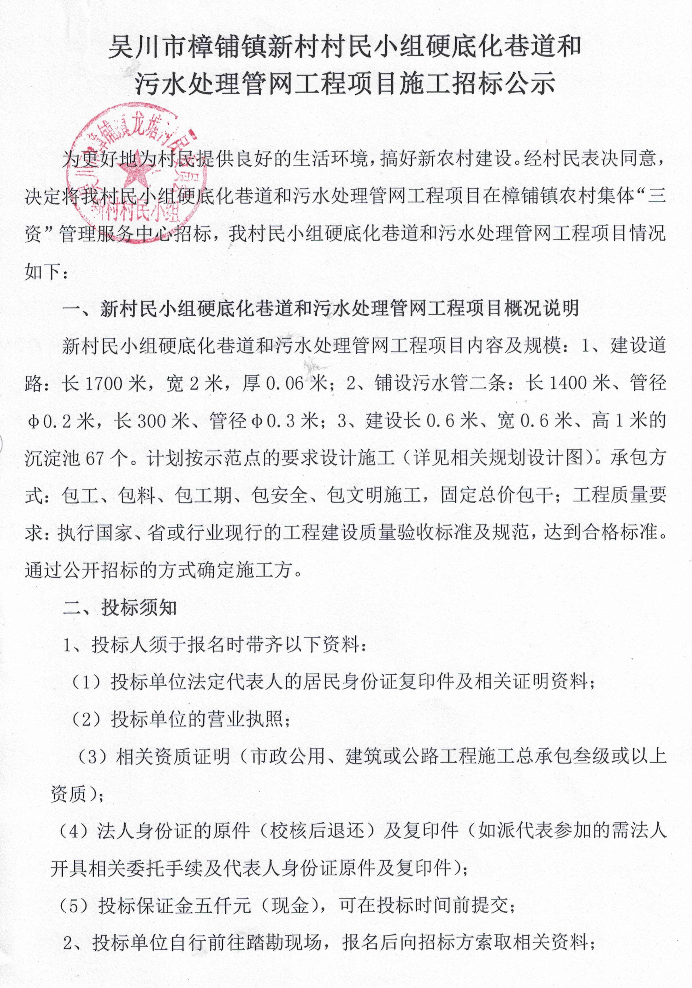 附件:吴川市樟铺镇新村村民小组硬底化巷道和污水处理管网工程项目施工招标公示2