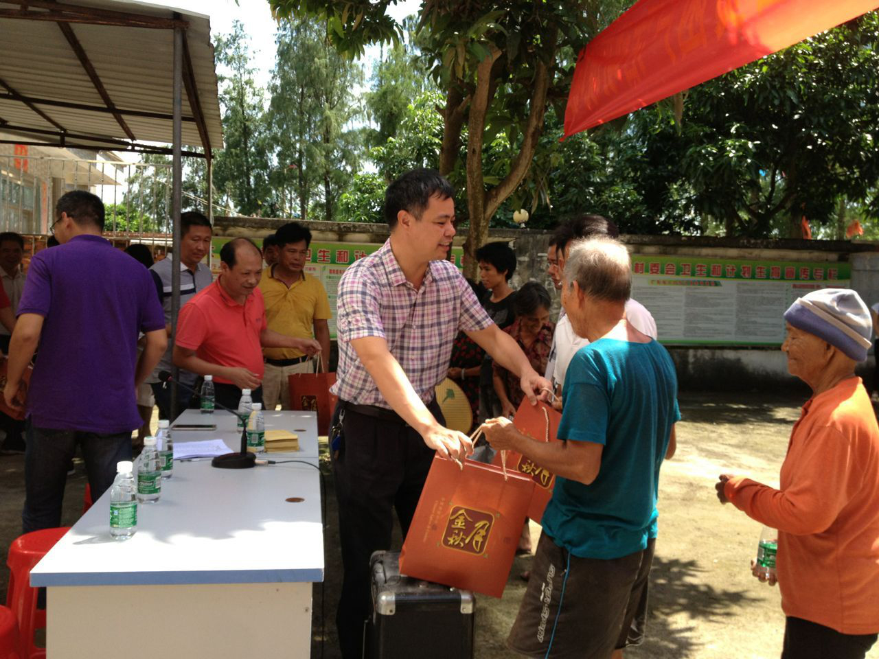 镇党委书记许剑桢和镇长李志强为贫困户送上节日慰问金及慰问品