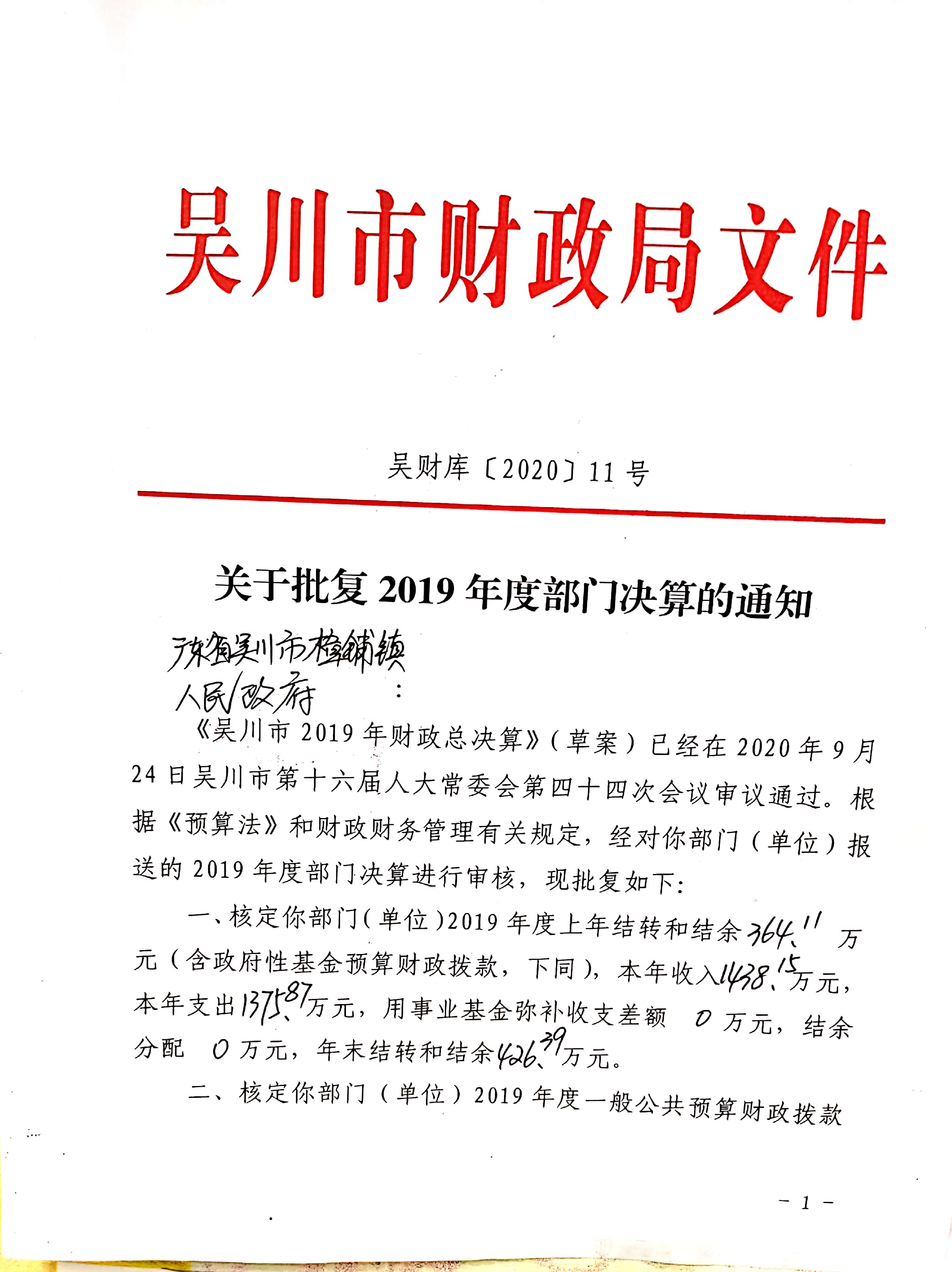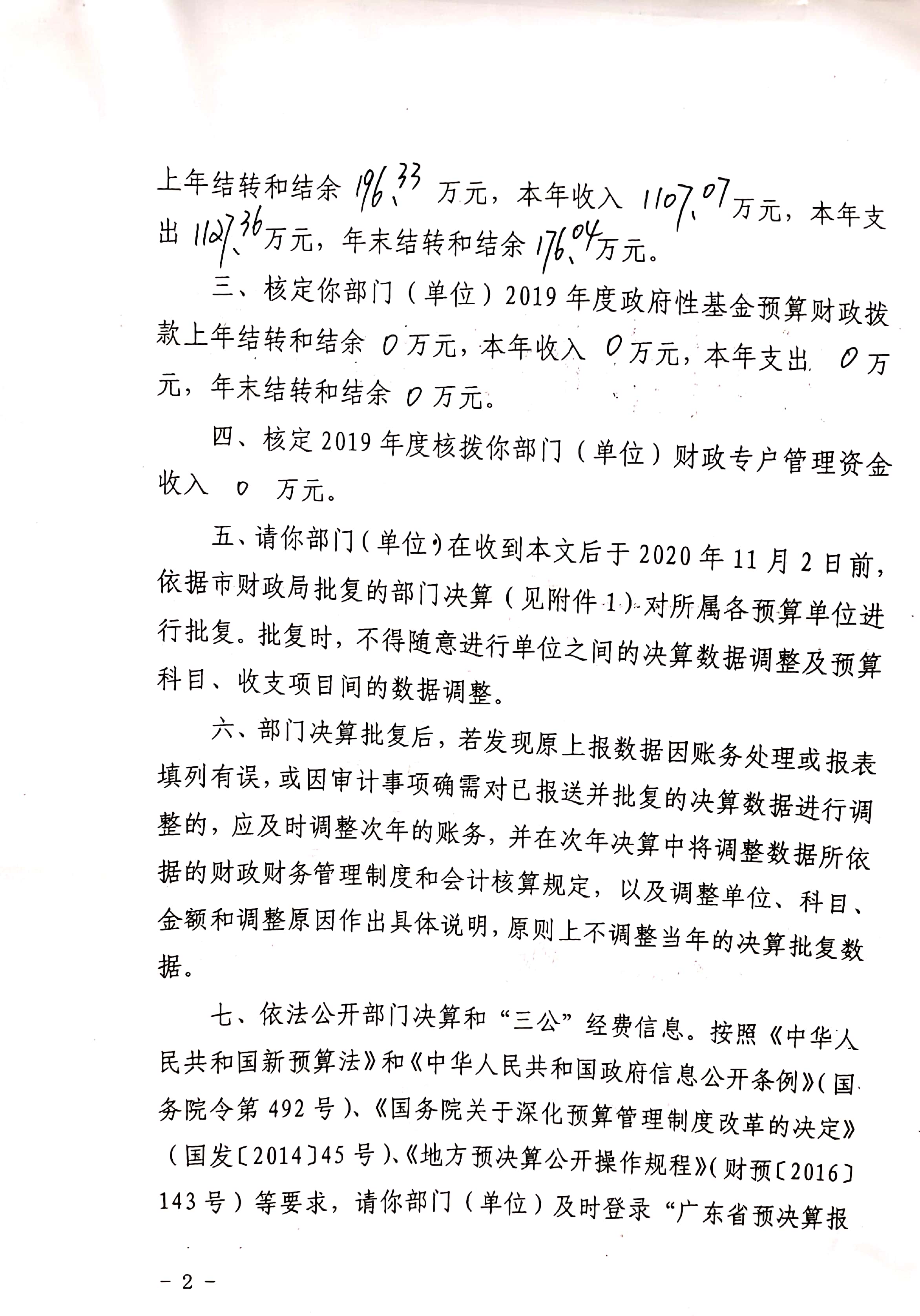 关于批复2019年度部门决算的通知
