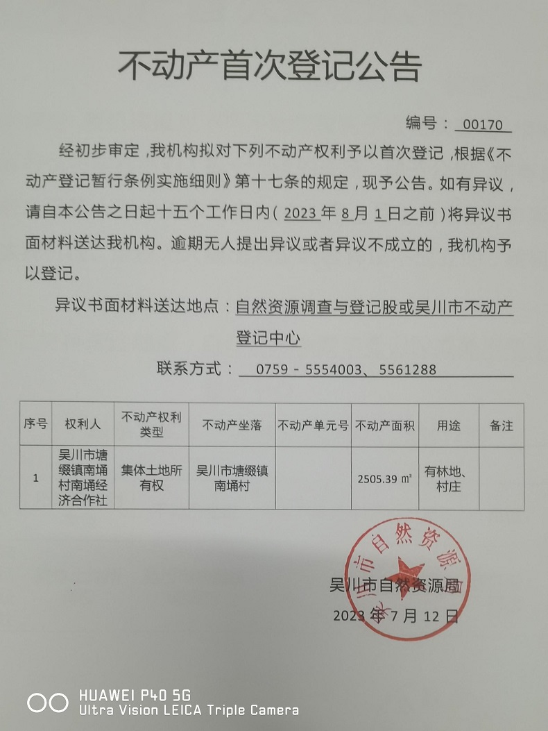 不动产首次登记公告(吴川市塘缀镇南埇村南埇经济合作社)2505.39