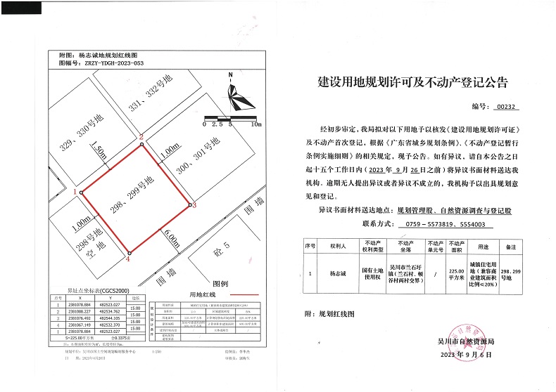 建设用地规划许可及不动产登记公告(杨志诚298、299号地)