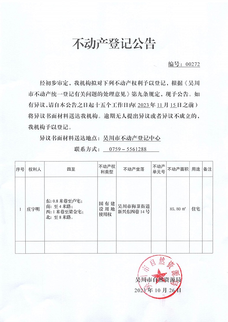 不动产登记公告(庄宇明)
