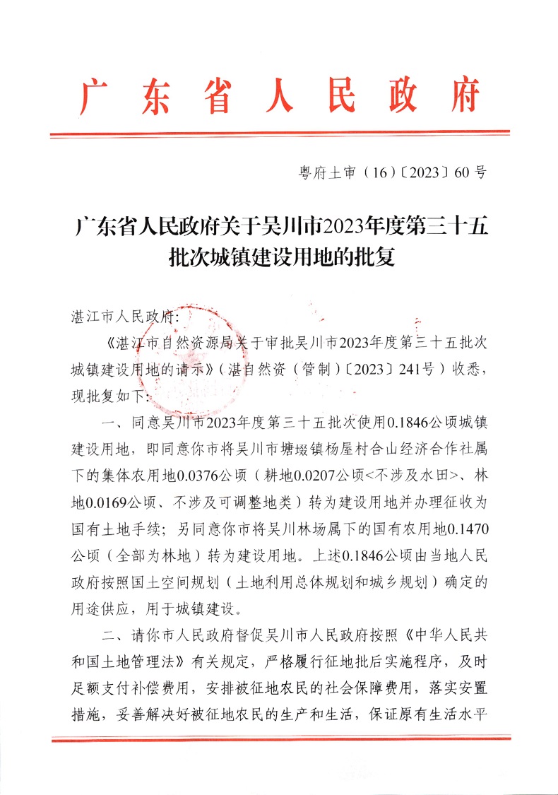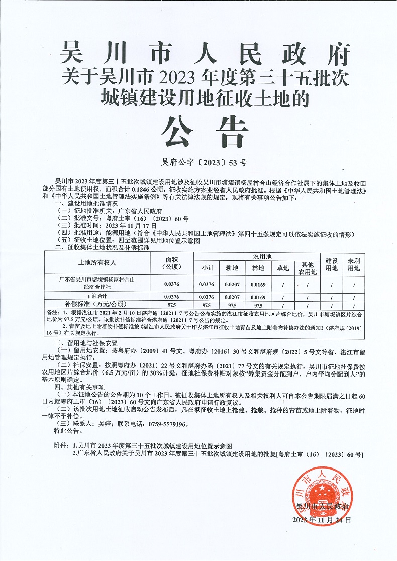 吴川市人民政府关于吴川市2023年度第三十五批次城镇建设用地征收土地的公告