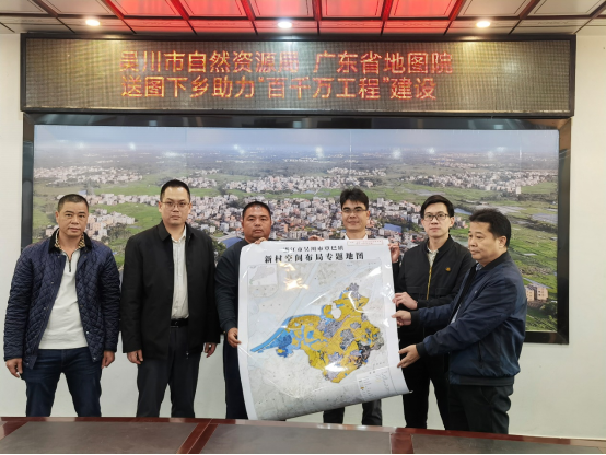 首批典型村空间布局专题地图由省自然资源厅、省林业局监制,省地图院负责编制,该地图按照行政村空间布局专题地图编制要求编制,在最新卫星影像图上叠加了基础地理信息数据和自然资源专题数据,是“卓粤·自然”党建引领高质量发展助力“百千万工程”的重要举措,也是助力吴川市“百千万工程”的重要地图保障。本次送出的专题地图涵盖吴川覃巴镇、黄坡镇、吴阳镇、兰石镇8个典型村。