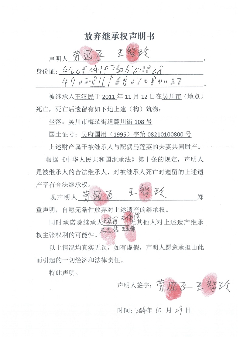 放弃继承权声明书(王英信、王志信、王伟信、王玉婵)