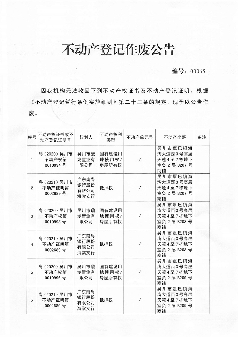 不动产登记作废公告(天麓4至7栋地下室负2层B207-210号商铺)