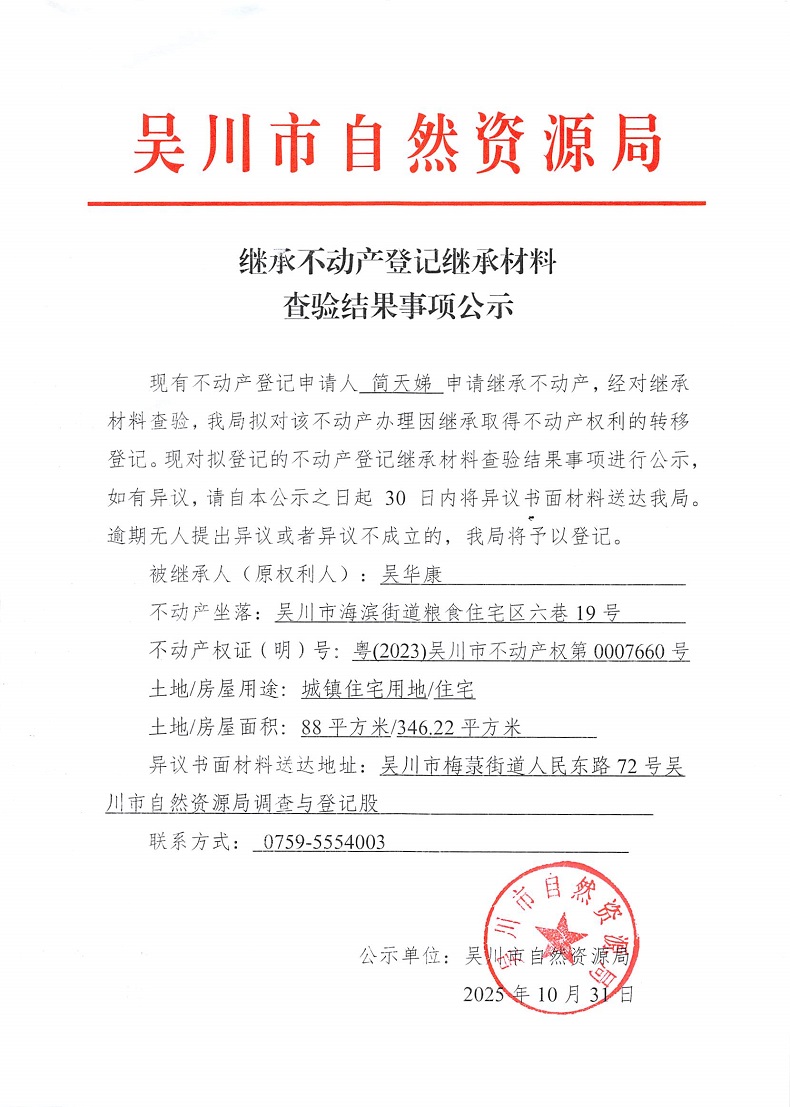 继承不动产登记继承材料查验结果事项公示(吴华康)