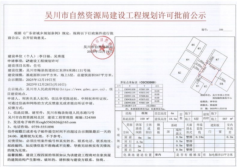 吴川市自然资源局建设工程规划许可批前公示(李日福、吴秀莲)